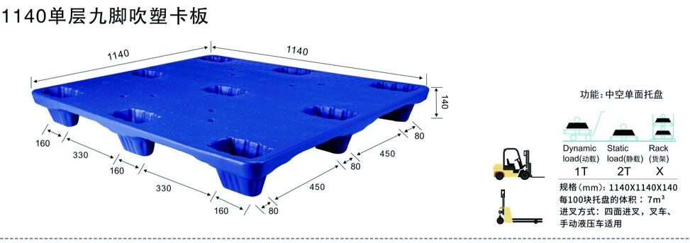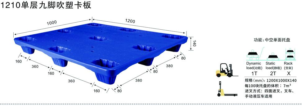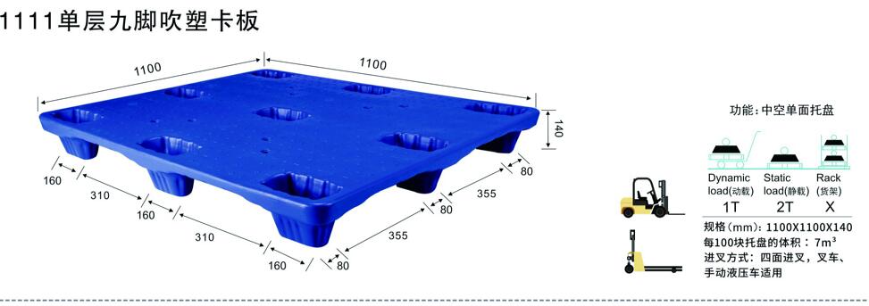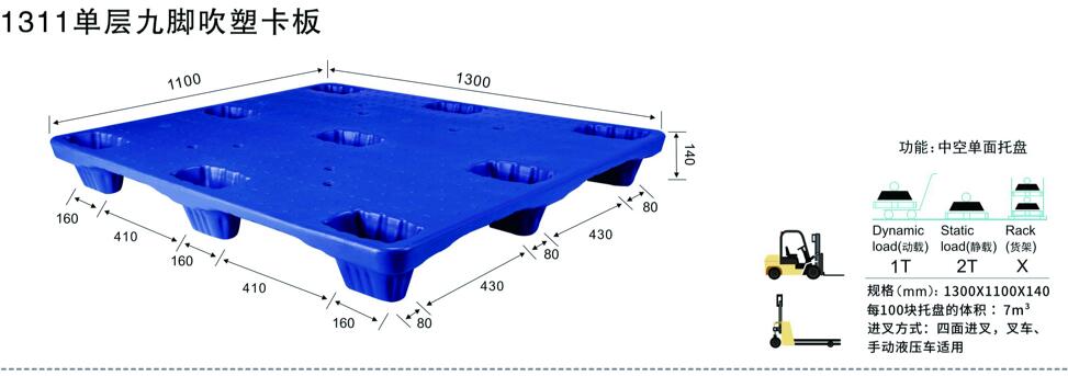 ● 吹塑托盘承载能力:静载荷:6~7T;动载荷:1~2T;架空载荷:1~1.5T。